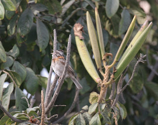 We hit a patch of vegetation that was boiling with birdsong: Yellow-billed Tit-Tyrant, White-browed Chat-Tyrant, Mourning Sierra-Finch, Band-tailed Sierra-Finch, Band-tailed Seedeater, Long-tailed Mockingbirds, Bare-eyed Ground-Doves, Collared Warbling-Finch, and Great Inca-Finch come to mind. The Great Inca-Finch is one of five
